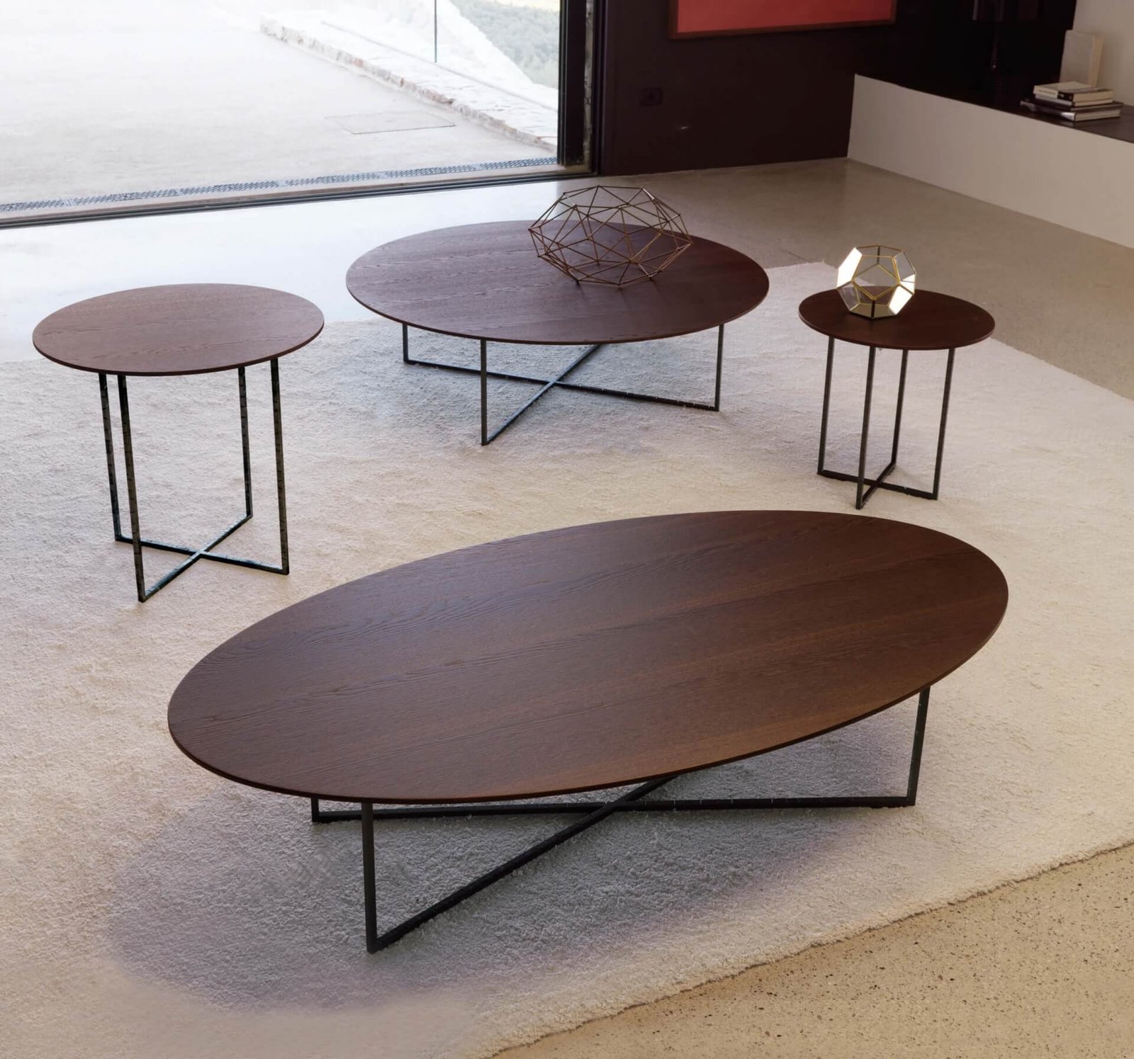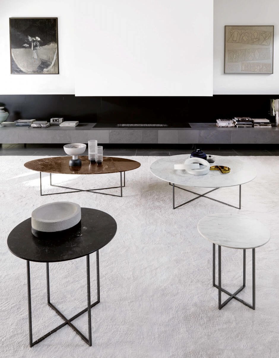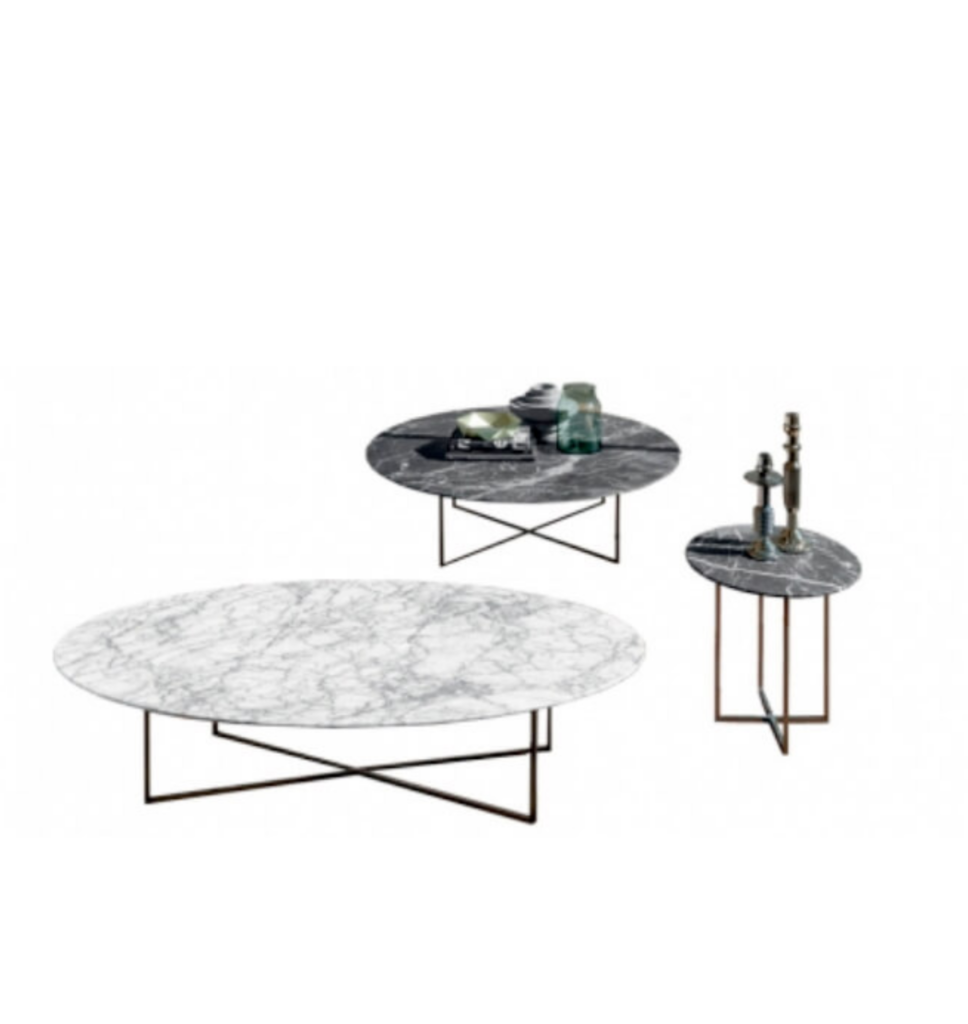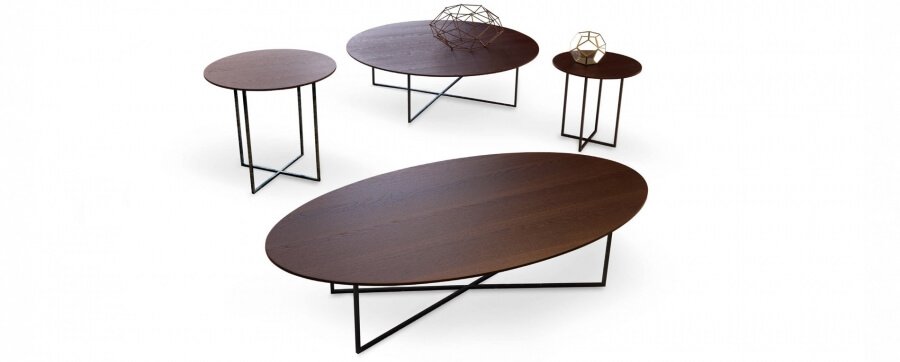 Sabi coffee tables have a matt bronze metal structure with a finish in relief and their geometric shapes remind one of the concept of Sabi, typical of Japanese culture to identify opposites.