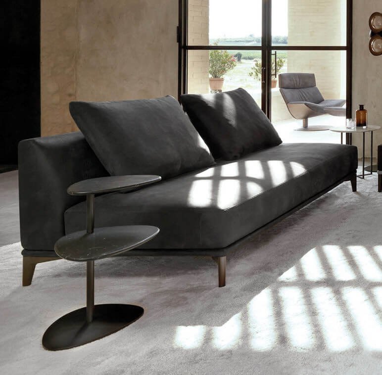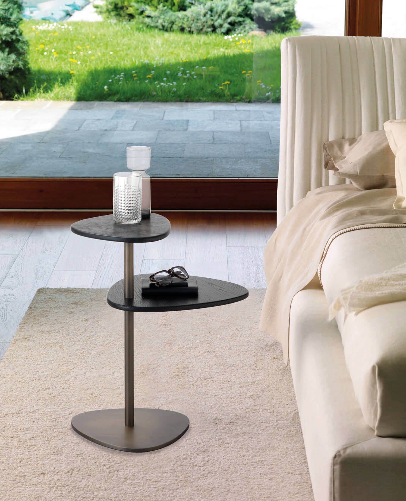 The Yori coffee table is inspired by delicate, traditional Japanese bonsai trees. Its frame consists in a matt bronze or gold metal pole fitted with two irregular-shaped shelves. The top one swivels.