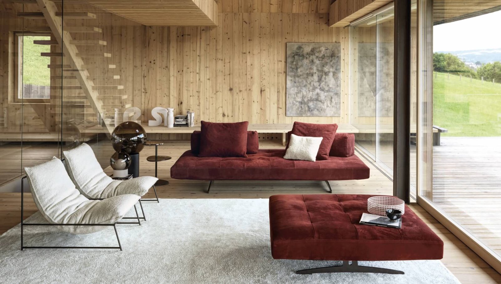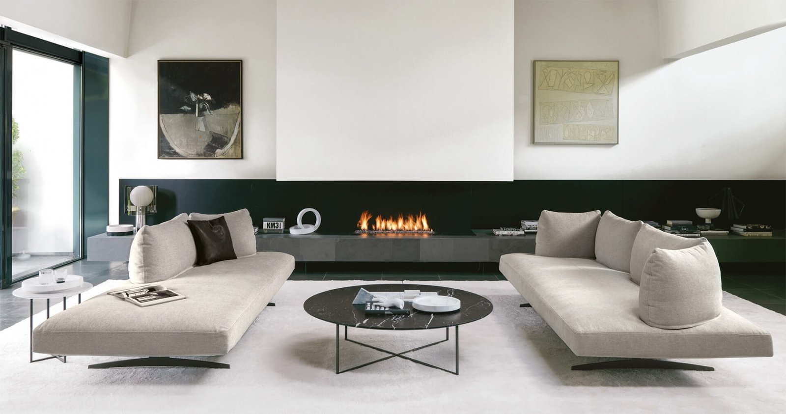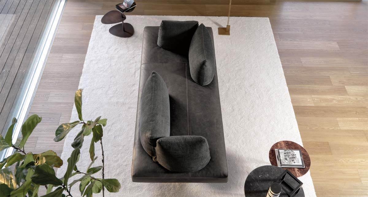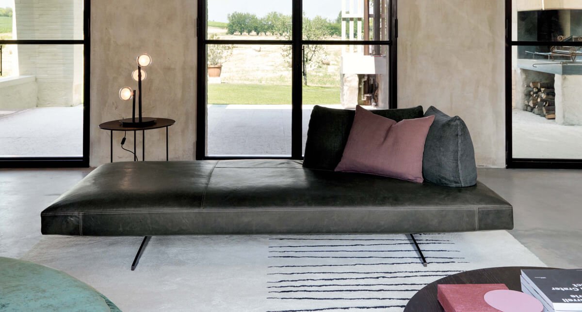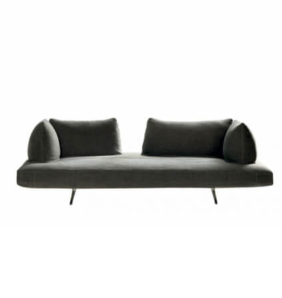 freestanding sofa designed for moments of togetherness: self-bearing and adjustable backs with a linear or curved shape can be positioned as desired to guarantee perfect comfort no matter the configuration. The range of elements – available in various sizes, depths and with different covers (quilted for the chic version) – guarantees extensive customisation and flexibility in terms of arrangements. The sculptural, metal base raises the sofa off the floor, conveying visual lightness.